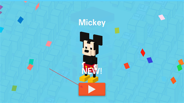 2、通过扭蛋获得新角色,在解锁界面看到NEW标识的Mickey后,点击播放按钮即可穿戴该角色对应的游戏环节。