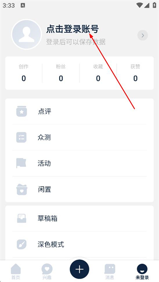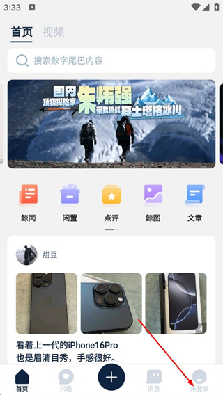 1、在数字尾巴首页,点击底部导航栏的未登录,进入个人页面。