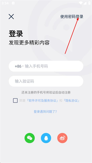 3、在登录页面,点击右上角的使用密码登录,切换到密码登录页面。
