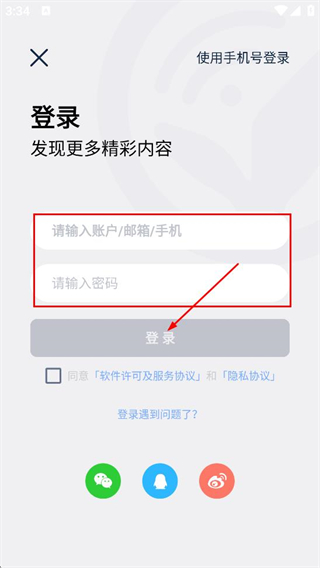 4、在密码登录页面,填写邮箱/手机与密码,点击登录,完成账号登录。