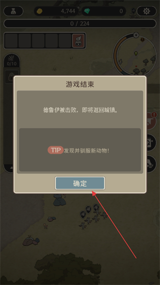 3、战斗失败后,在游戏结束界面点击确定,返回城镇重新准备。