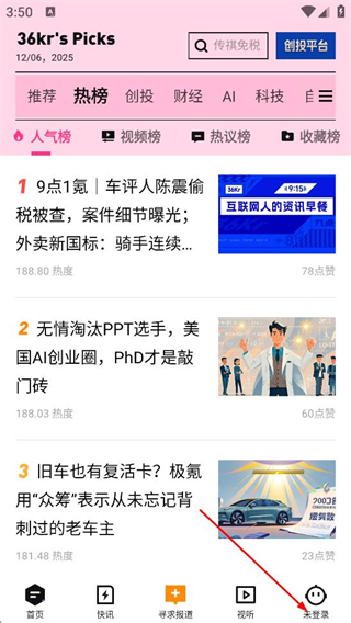1、在36氪首页,点击底部导航栏的未登录,进入个人页面。