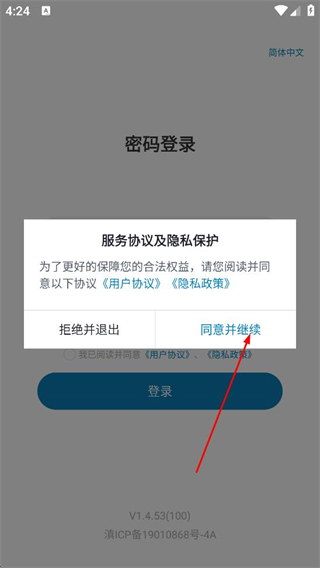 1、在服务协议及隐私保护弹窗中,点击同意,进入密码登录的信息填写页面。