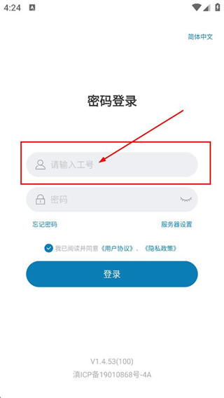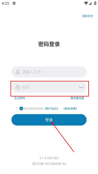 2、随后我们可以在密码登录页面,填写请输入工号对应的工号的内容。