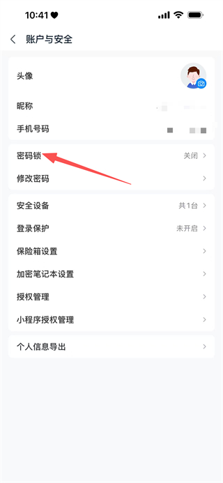 4、在账户与安全页面,点击密码锁选项,进入密码锁页面。