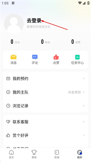 1、在球迷屋的首页,点击底部的我的选项,进入首页。