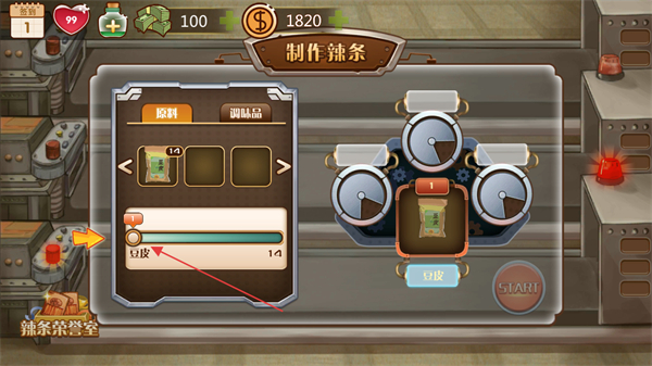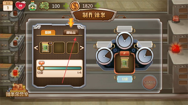 1、在制作辣条界面,选择食材如豆皮和调味品,添加到对应槽位。
