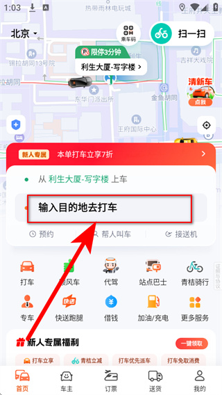 2、在进入首页后,点击输入目的地去打车的输入框,进入搜索界面。