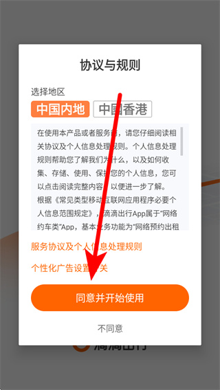 1、打开滴滴出行APP,在弹窗中选择所在地区,点击同意并开始使用,进入首页。