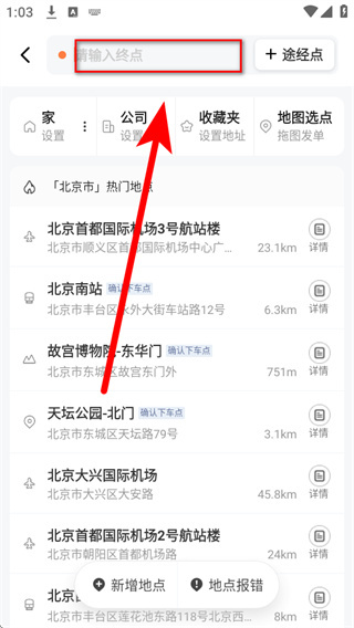 3、在搜索界面,填写要前往的终点和途经点,选择匹配的地点选项。