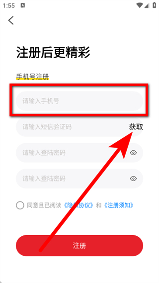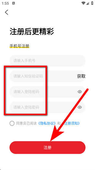 4、输入短信验证码及登录密码,勾选协议后,点击注册,完成注册。