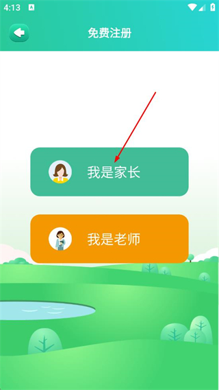 2、在免费注册页面,点击我是家长的按钮,进入对应的注册选择界面。