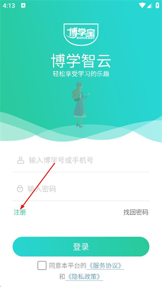 1、在博学宝登录页,点击页面中的注册的选项,进入注册界面。
