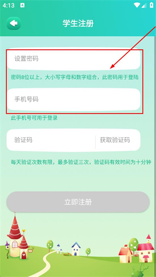4、随后我们在学生注册页面,先填写设置密码与手机号码,这两项重要信息。