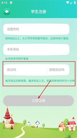 5、在学生注册页填写验证码,确认信息无误后,点击立即注册,即可完成注册。
