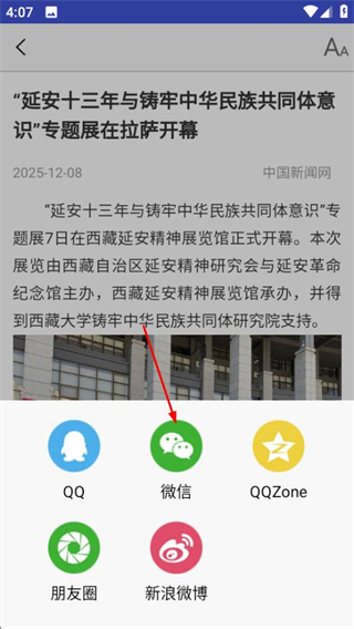 3、在分享弹窗中,选择微信渠道,可将文章分享到微信。