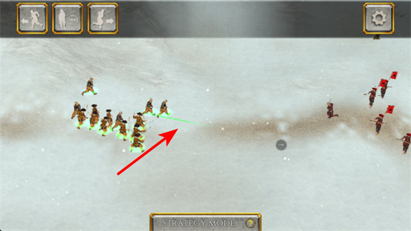 2、进入战斗后,切换至策略模式可指挥部队移动或调整进攻方向,通过集中兵力集火敌方单位,快速削弱敌方战力,推进战场优势的建立。