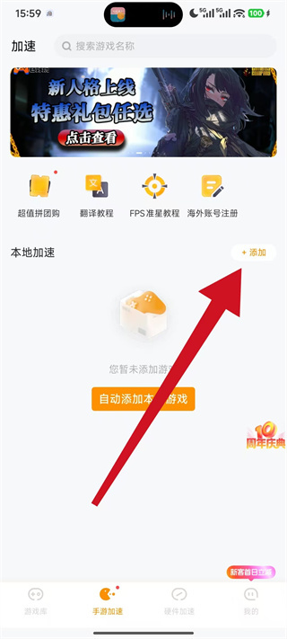 1、打开雷神手游加速器APP,在主界面“本地加速”板块的右侧,点击添加,进入游戏页面。