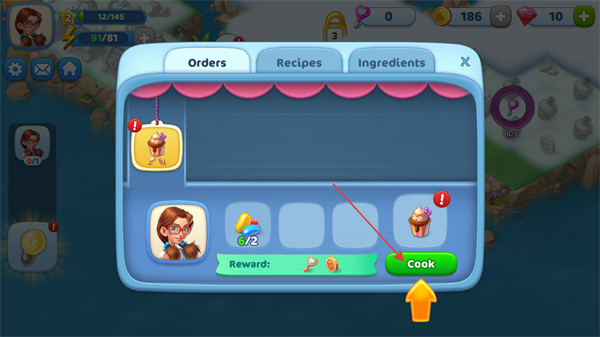 1、在童话融合记游戏界面中,获取到糖豆后点击选中人物,点击Cook按钮来制作冰淇淋,完成此订单以获取对应的奖励。