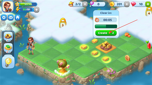 2、处于当前游戏场景时,点击Create按钮消耗对应能量,生成所需的材料,为后续制作订单物品做准备。