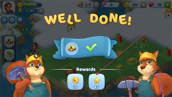 4、完成任务后出现WELLDONE提示,可获取完成任务的金币与星星奖励,这些奖励可用于后续游戏操作。