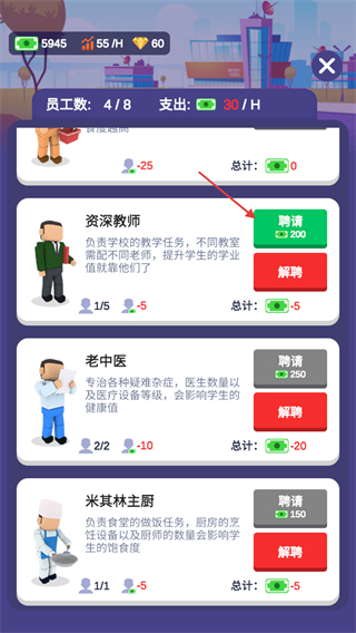 1、点击资深教师旁的聘请按钮,消耗钱雇佣,提升学生学业值,注意员工数上限。