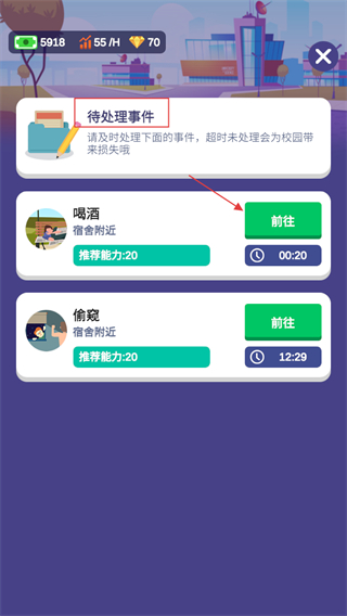 3、在待处理事件界面点击前往,及时处理宿舍附近的喝酒等事件,避免校园损失。