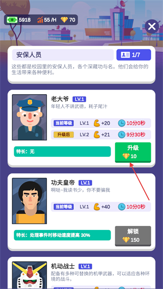 4、消耗钻石点击升级,提升老大爷等级,缩短其处理事件的耗时,优化校园管理。