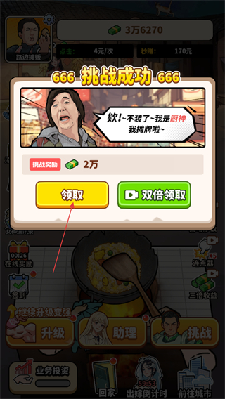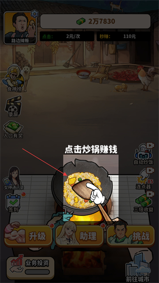 1、根据提示点击炒锅赚钱,每次点击炒锅可获得即时收益。