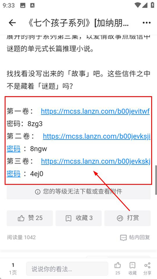 3、在帖子详情页,点击对应的下载链接及密码,获取小说资源阅读小说。