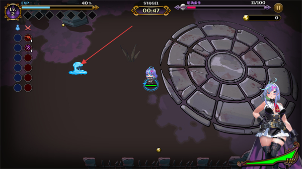 3、在STAGE1的战斗场景中,操控角色击败蓝色怪物,同时关注EXP进度与明确条件推进关卡。