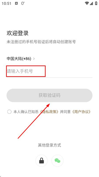 2、在登录页面填写手机号,勾选协议后,点击获取验证码。