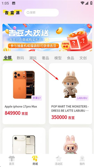 1、在吉盒派首页,点击底部的商城选项,进入商城商品列表页面。