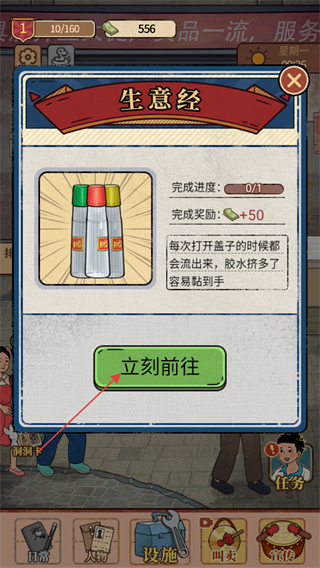 1、点击界面的任务,查看生意经任务如解锁胶水,点击立刻前往推进任务。