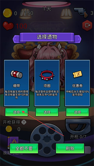 2、在选择遗物环节,可点击绷带、项圈、优惠券下方的选择按钮选遗物,也能点全都不要或刷新调整,选后推进流程。