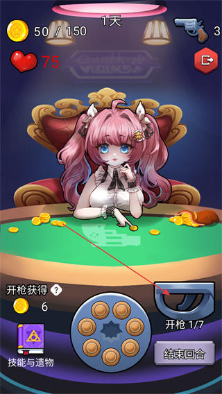 3、进入回合后,点击界面中的开枪按钮执行操作,当前显示开枪1/7,每次开枪会获得对应金币,需完成7次开枪进度。