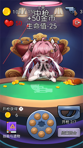 4、出现中枪提示后,会获得+50金币但生命值-25,继续点击开枪完成剩余次数,需留意生命值的变化情况。