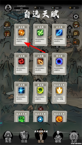 2、进入自选天赋界面后,选择对应属性的天赋,这是确定修仙初始增益的核心操作,不同天赋对应不同的属性加成,自身修炼方向选择。
