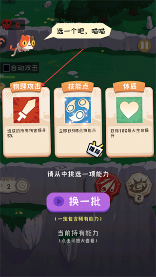1、在能力选择界面选不同词条,提升人物的属性,增强战斗输出能力。