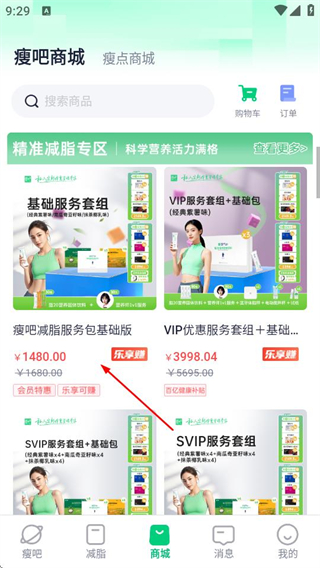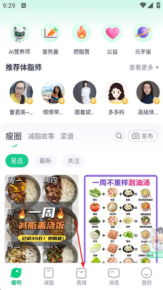 1、在瘦吧首页,点击底部的商城选项,进入瘦吧商城页面。