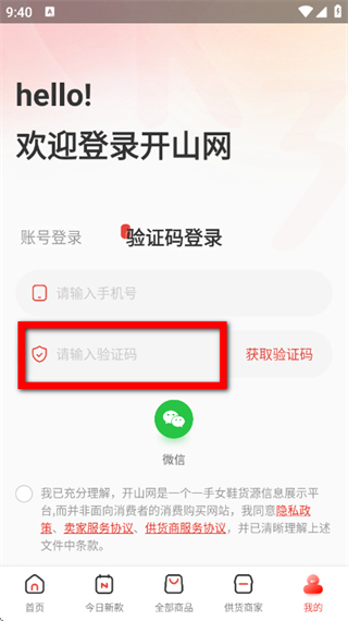 2、在登录界面,点击验证码登录,切换到验证码登录页面。