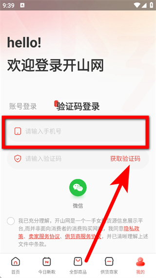 3、在验证码登录页面,输入手机号,点击获取验证码。