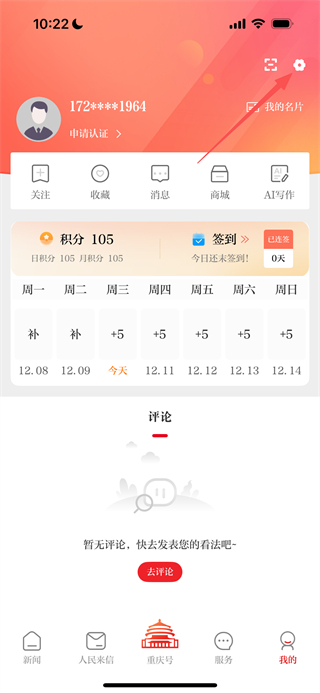 1、在新重庆首页,点击底部的我的选项,进入个人中心页面。