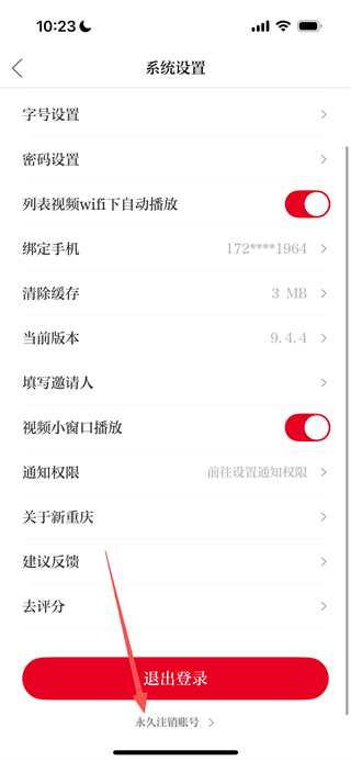 3、在设置页面,点击永久注销账号选项,进入账号注销协议页面。