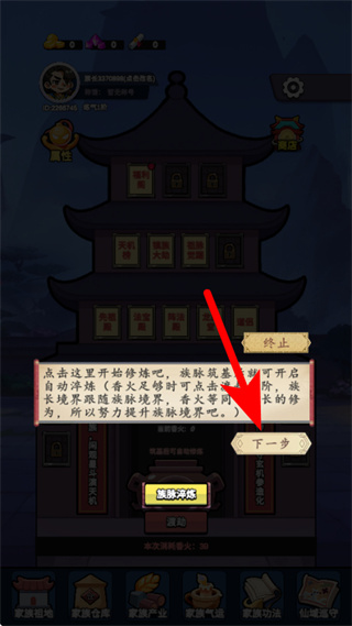 2、进入主界面后,先点击下一步关闭引导提示,再点击家族淬炼按钮开始修炼。