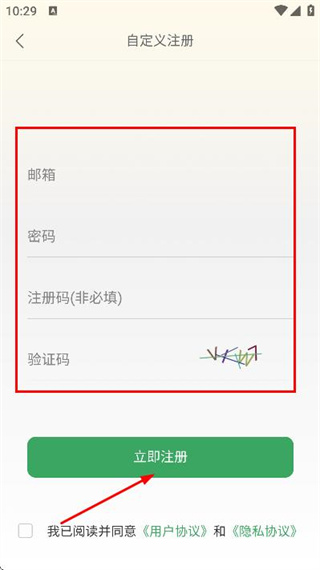 3、在自定义注册页面填写信息并勾选协议后,点击立即注册按钮完成注册操作。
