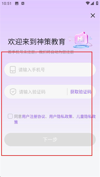 3、在登录页面,填写信息并勾选协议后,点击下一步完成账号登录。