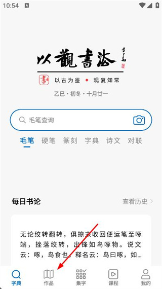 1、在以观书法首页点击底部的作品选项,进入作品页面。