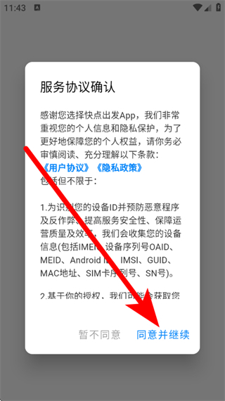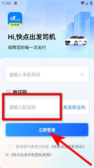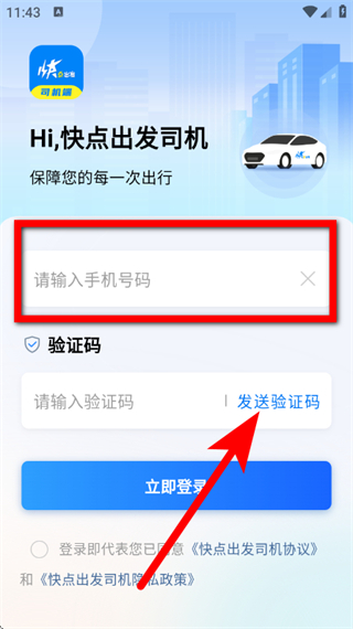 1、打开快点出发司机,在弹窗点击同意并继续,进入登录界面。