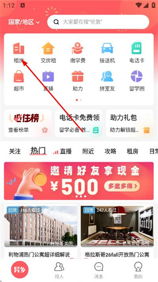 1、在应用首页点击租房选项,进入异乡好居的租房页面。